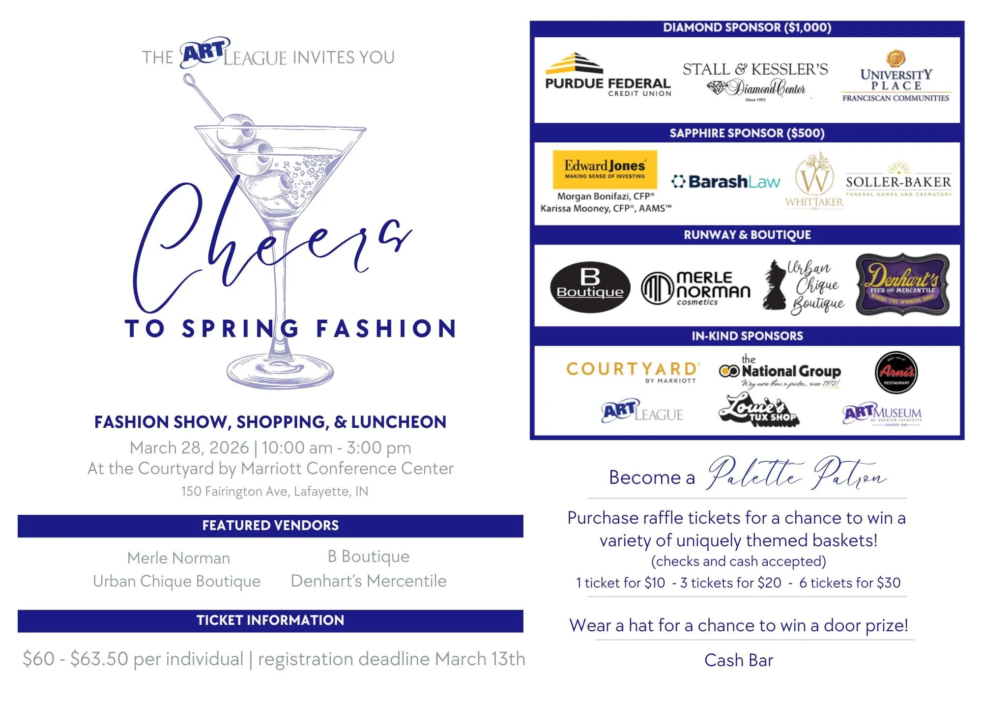 Join us for a style-filled day at the Art League’s annual Fashion Show fundraiser! Shop stunning pieces off the runway or on the rack, enjoy drinks from the cash bar, bid on fabulous raffle baskets, and savor a delicious lunch all in support of the arts.