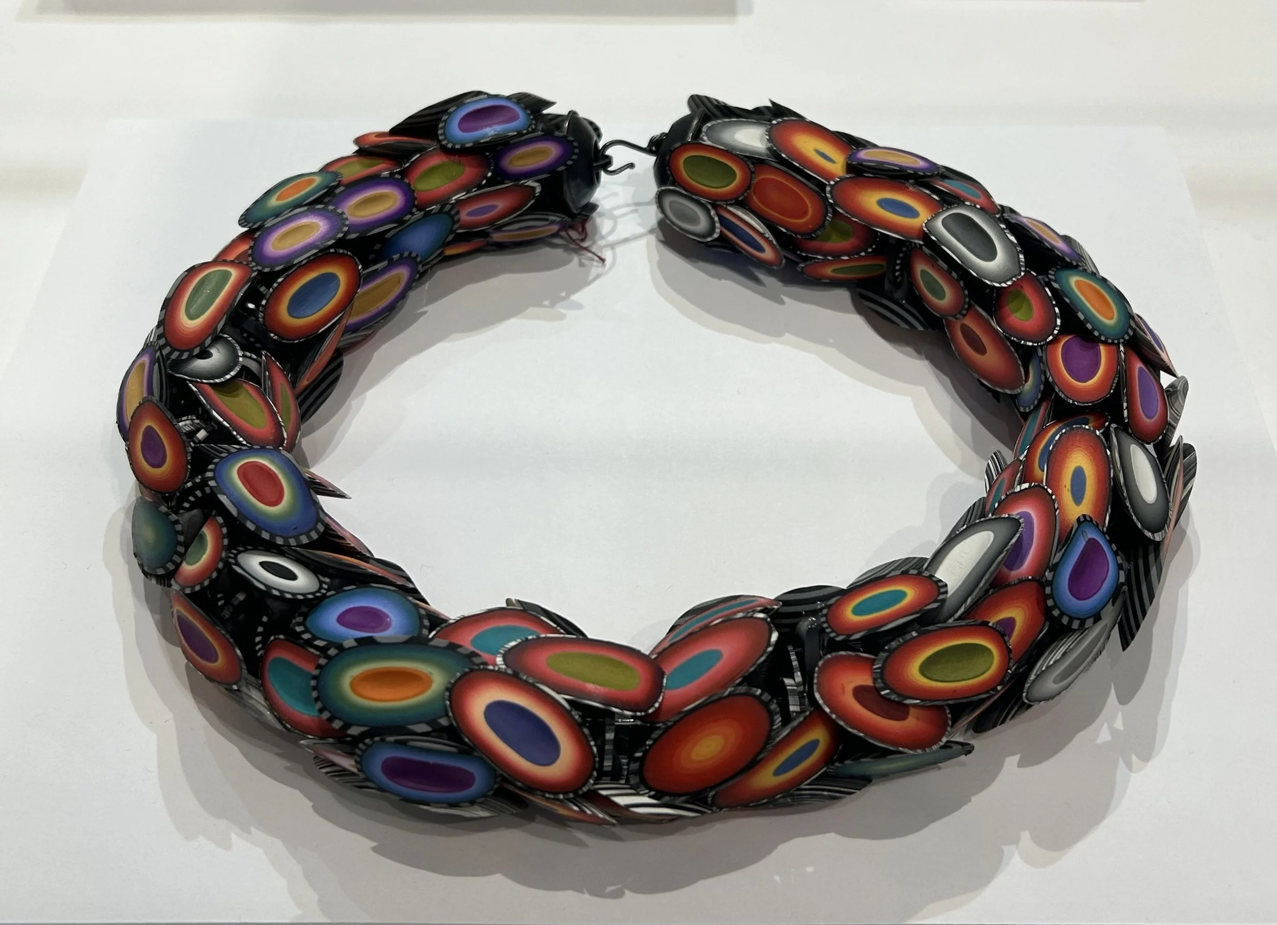 Our artistic collaboration began in 1984 when we met in Rome during a year abroad program through the Tyler School of Art. Immediately, we were intrigued by some essential differences in our approach to painting, and these distinctions led to heated debates. David created large, abstract paintings, focusing on the richness of surface treatment. Steve’s work, in contrast, addressed the question, “How can I make a painting as an object, a fully integrated three-dimensional piece?” We liked how our differences challenged our individual thinking. To learn from each other, we started trading half-finished drawings and paintings and working both of our ideas into them. This “swapping” has become an essential element of our collaboration. After years of working side by side, David moved to Santa Fe in 2005. We have tables in our Philadelphia studio with half-finished brooches. Steve sends them to David, who develops them further. Other threads from our art-school days continue to be important. While David’s strength has always been to push color, pattern, and surface in new directions, Steve is constantly fascinated by three-dimensional structures and the ways things fit together mechanically. Throughout our collaboration, we have often looked to nature for inspiration. In seed clusters, shell formations, and flower buds, for instance, numerous carefully organized parts, seemingly identical but unique, are arranged beautifully. These exquisite structures led us to new ways of envisioning necklaces, for example, both three-dimensionally and texturally. Many of our brooches are like collections of fragments. Not necessarily of literal fragments, like shards of pottery, but more like conceptual fragments, like a piece of music, a chapter from a story, an ingredient from a cuisine, or an element of a language. At some point, however, we let the references subside and allow the color, abstract patterns, and form to lead us. The work feels complete to us when the balance of elements–abstract and imagistic–comes into focus in some unusual way. At the same time, the viewer is free to gather his/her impression of these suggested images.